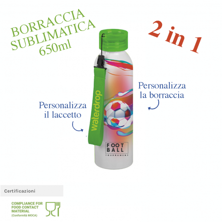 Una simpatica ed utilissima borraccia personalizzabile con la tecnica della sublimazione sia nel laccetto che nel fusto. La borraccia può contenere 650ml ed è disponibile nei colori nero, verde, arancio, rosso e blu. La borraccia è bianca ed il colore che sceglierai sarà relativo al tappo (avvitabile) e al laccetto incluso.