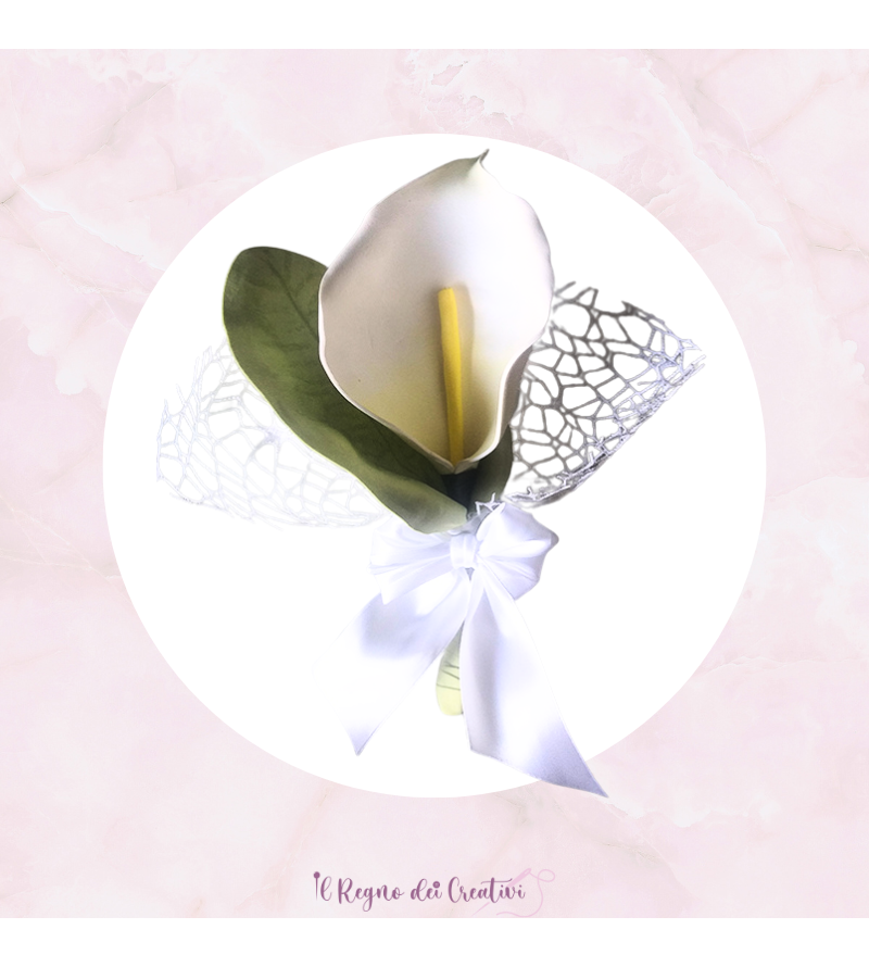Una calla decorata con organza a rete ed un fiocco in raso. Interamente realizzata in fommy e sfumata con colori ad olio. Ideale per abbellire una tavola da cerimonia e rappresentare un segnaposto per i tuoi ospiti.