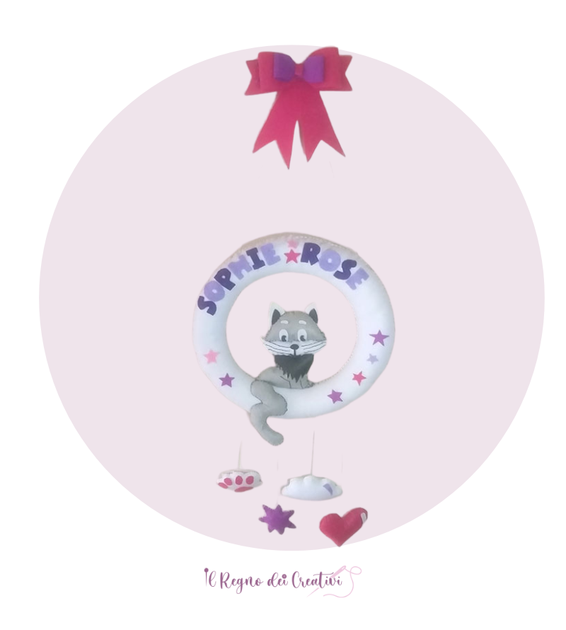 Fiocco nascita gattino realizzato totalmente a mano in pannolenci. Pendenti con nuvoletta, stellina, cuoricino e zampina del gatto.