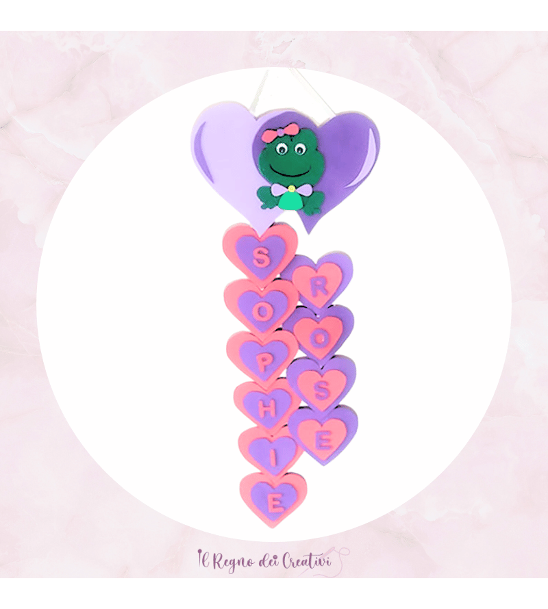 Un dolcissimo fuori porta ricco di cuori con un simpatico ranocchietto. Creazione realizzata artiginalmente in fommy 2mm e personalizzabile nella scritta, colore e fantasia a scelta. Articolo commissionabile con tempi di spedizione da definire in fase di ordine.