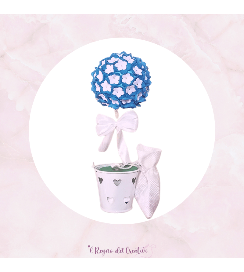 Una tenera bomboniera adatta ad un battesimo così come a tante altre occasioni realizzata interamente a mano con ortensie in gomma crepla rette da un bastoncino di legno, fiocco in raso e sacchetto con confetti. Trattandosi di un prodotto artigianale, i tempi di personalizzazione e consegna vanno definiti con almeno 30 giorni di preavviso con il servizio clienti tramite email o whatsapp. articolo
