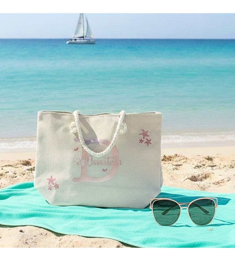 Una fantastica borsa mare in cotone riciclato 220gr con manici in corda. personalizzata per rendere la tua estate chic e originale. Personalizzazione con tecnica del termovinile/dtf con Personalizzazione a scelta secondo il tuo gusto. Dimensioni 55x15x39cm.