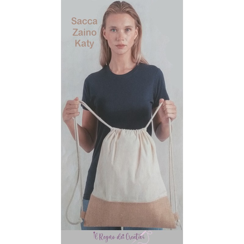 Una sacca zaino in juta e cotone con doppia corda di chiusura da personalizzare con ricamo oppure termovinile.