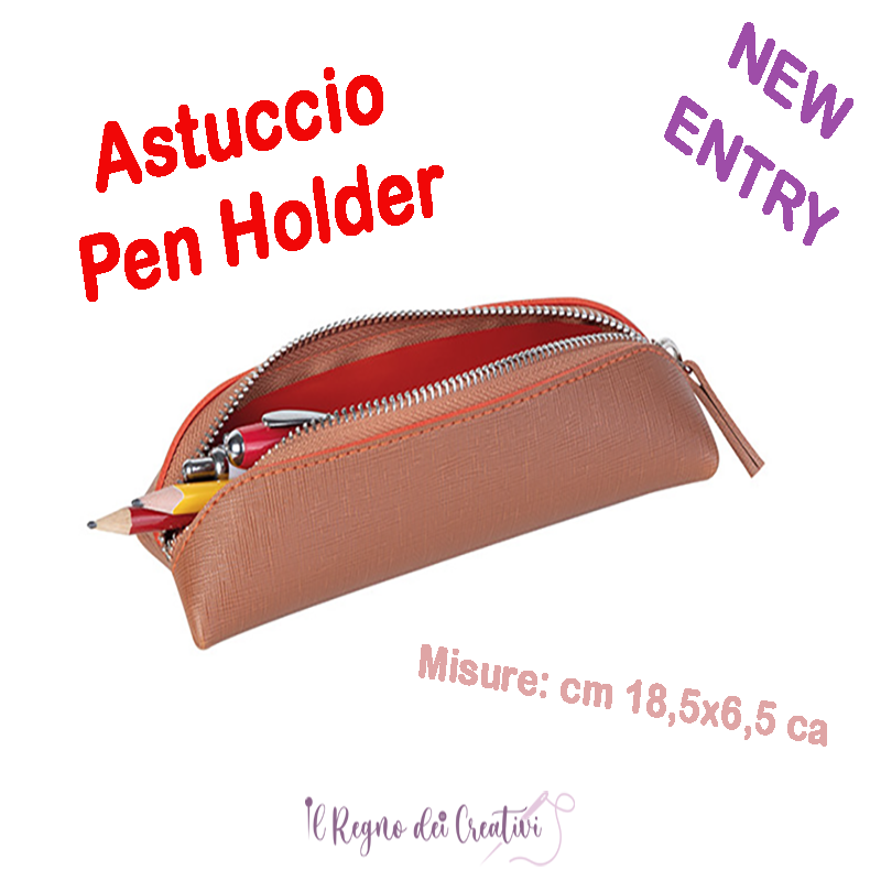 Astuccio in poliuretano bicolore con chiusura a zip corredata di astuccio. Tecnica di stampa consigliata: serigrafica, incisione e a caldo. Dimensioni 18,5 x 6,5 cm.